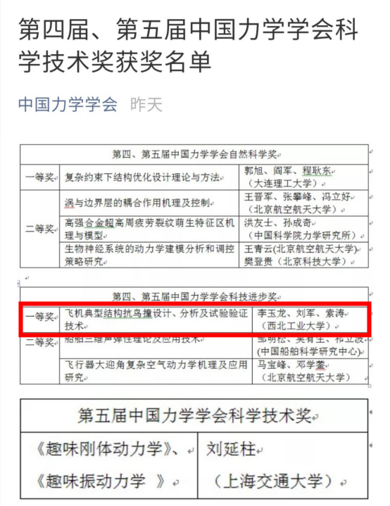 8月26日“中国力学大会-2019”开幕式上,举行了第四届、第五届中国力学学会科学技术奖颁奖仪式。肉漫画 李玉龙、刘军、索涛三位教授的“飞机典型结构抗鸟撞设计、分析及试验验证技术”项目荣获第四届、第五届中国力学学会科技进步奖一等奖。