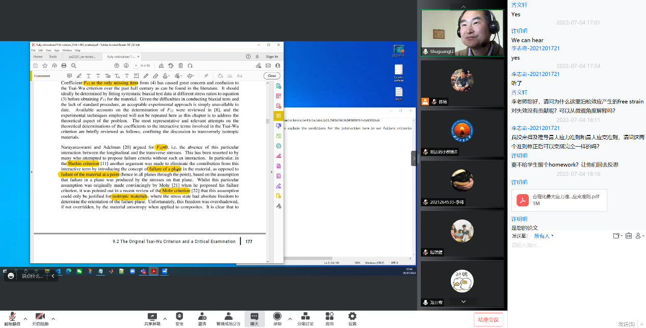 课程中,同学们与李曙光教授就复合材料失效准则的未来研究方向、大数据在复合材料失效中的应用前景以及各类失效准则在航空结构中的应用情况等方面进行了交流研讨。同学们对此次课程给予了高度评价,同时对李曙光老师的精彩课程内容与耐心解答表示了感激。