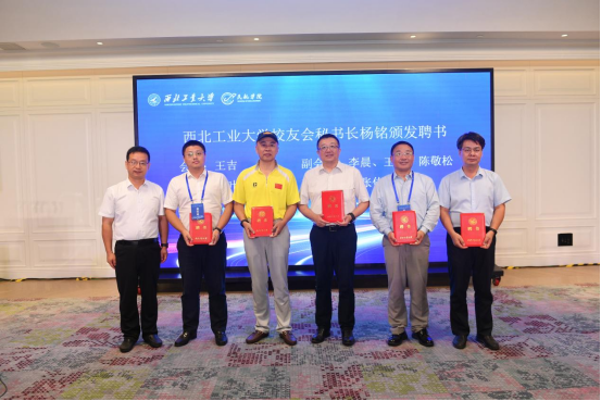 校友会秘书长杨铭为通航分会会长王吉,副会长李晨、王俊、陈敬松,秘书长叶欣桥,副秘书长张传勇颁发聘书,王吉会长致辞。