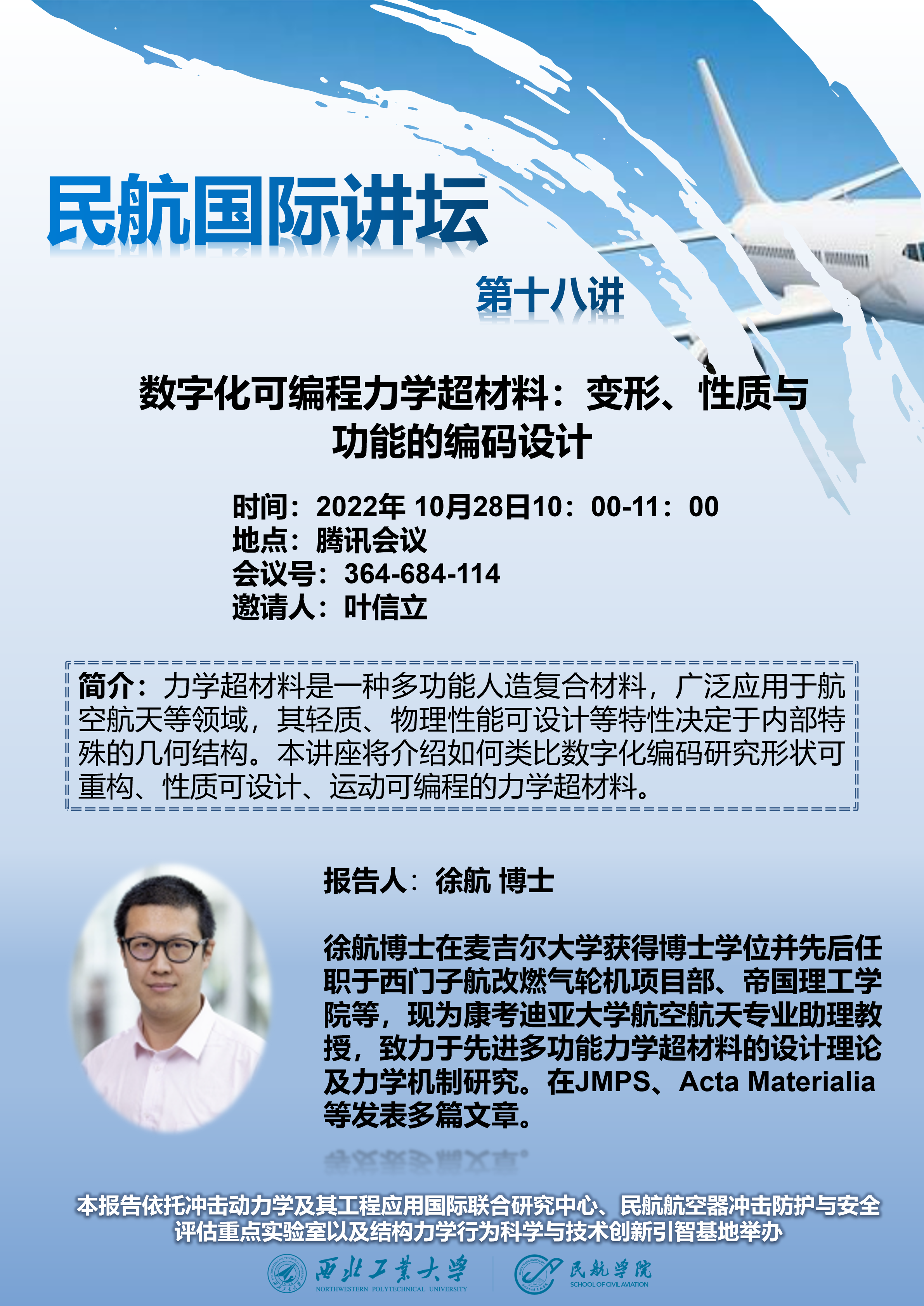 10月28号上午十点,肉漫画 拟线上举办“数字化可编程力学超材料:变形、性质与功能的编码设计”专题讲座,届时欢迎各位老师同学参会交流。以下是讲座详细信息: