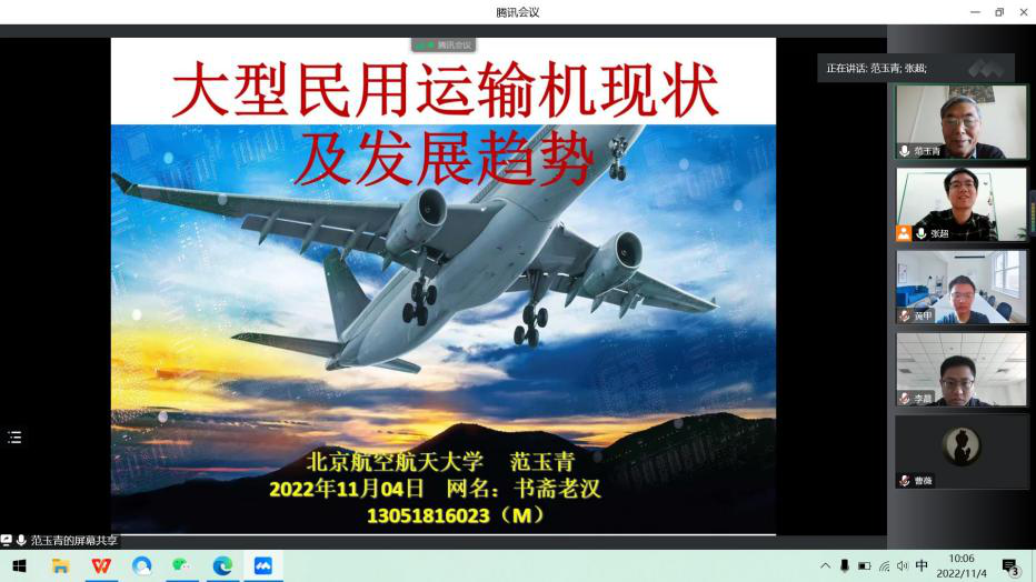 邀请我国航空制造领域专家——北京航空航天大学范玉青教授,面向学院全体师生,做了题为《大型民用运输机现状及发展趋势》的报告会,学院党总支理论学习中心组成员以及学院师生在毅字楼205会议室和腾讯会议参加。