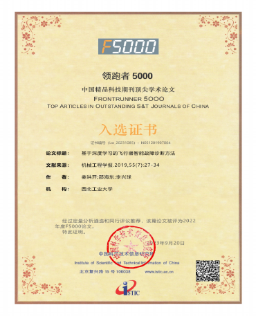 姜洪开教授发表在机械工程学报上的“基于深度学习的飞行器智能故障诊断方法”经过定量分析遴选和同行评议推荐,被评为2022年度F5000论文。