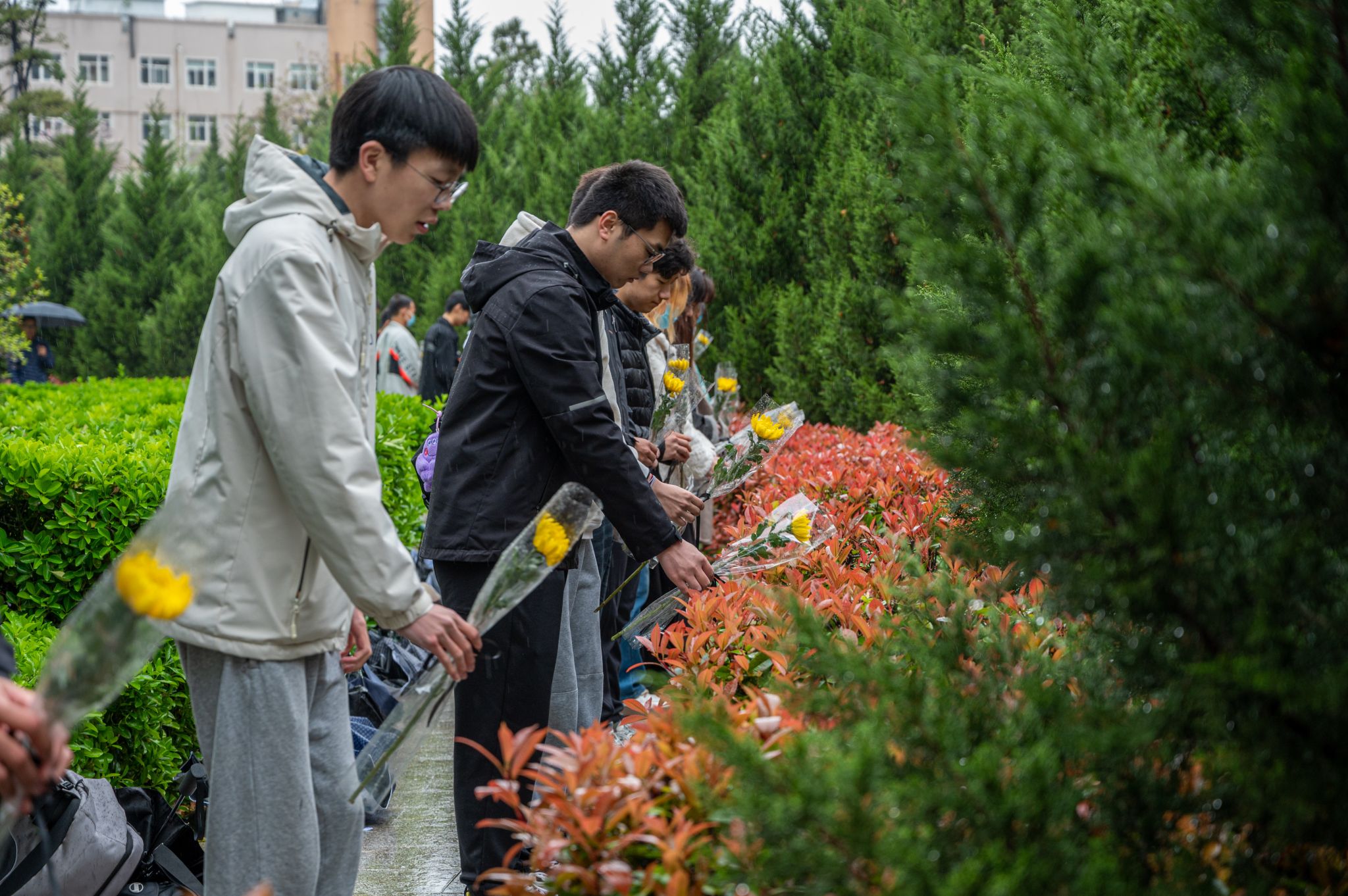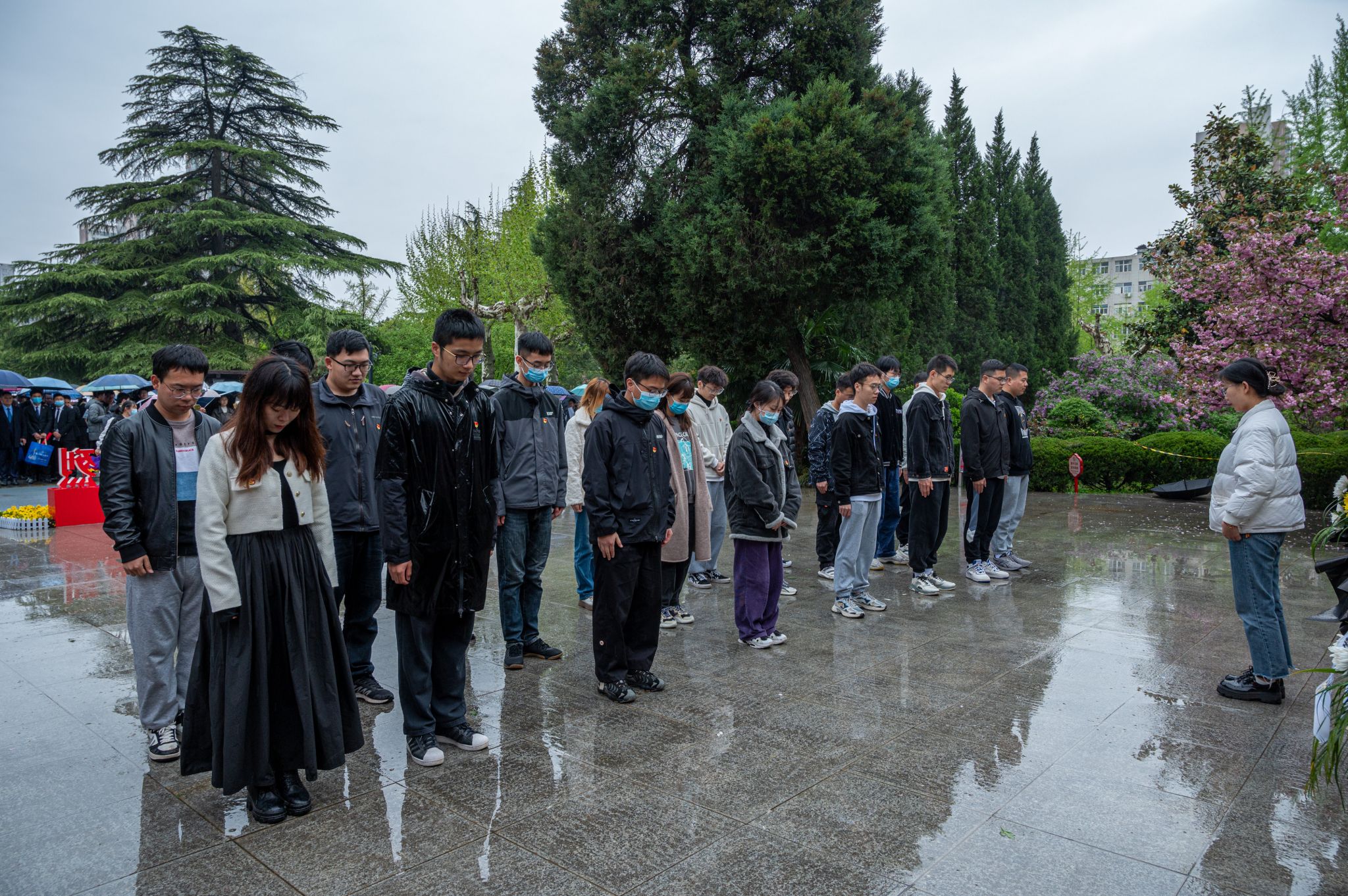 张睿:虽然阴雨蒙蒙,凉风清冷,但莘莘学子庄严肃穆,面对一座座丰碑,自发默契地默哀,是我们对先辈英勇奉献的崇高致敬,也许这就是早期共产党人的血脉精神。重温入党誓词,不忘初心,牢记使命,传承先辈们的革命精神!我们的崇敬寄托于黄菊,向永垂不朽的人民英雄致敬。