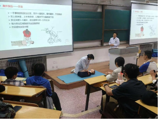 在理论学习后,学生们分成小组,进行实际操作演练。在各位医生的带领下,学生们依次进行了心肺复苏的模拟演练。