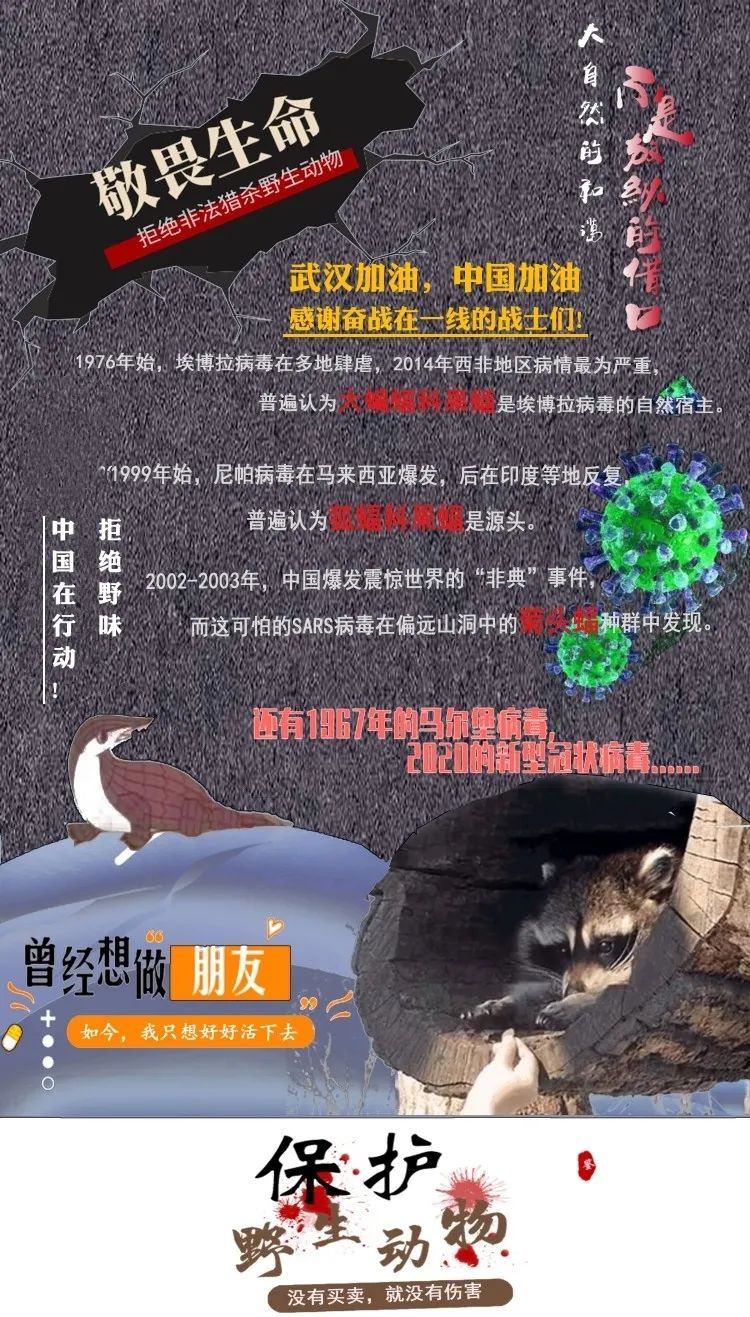 作品说明:为了宣传“拒绝非法猎杀野生动物,拒绝食用野味”,国家对于非法野味的惩治提上日程,相继发布有关文件等,,加入了包括“埃博拉、尼帕病毒”肆虐的曾经的惨痛教训的知识普及,以及曾经葫芦兄弟中的可爱的穿山甲形象和对人类已经有所抵触的狸猫,严格抵制非法野味贩卖刻不容缓;同时也加入为疫情一线的工作者加油,为武汉加油等。