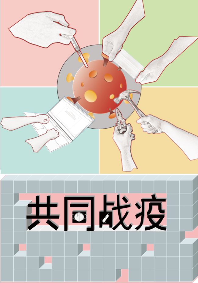 作品说明:红色象征着危险,所以红色区块主体为战疫一线的医生,使用针管作为医生的象征。黄色代表着土地,也代表着在建筑工地运作的机械。绿色代表着生命,代表着畅通。蓝色代表天空,进而可以想象到云彩。各地学生及各行各业的工作者利用“云平台”在家中进行工作。背景立体方块代表着全国各地输送的物资,这些物资中蕴含的是全国各地的关心与爱,借助红色背景烘托这份感情。文字“共同战疫”中借助口罩和针头替代方块,再次强调“战疫”二字,并强调要积极进行防护和治疗。