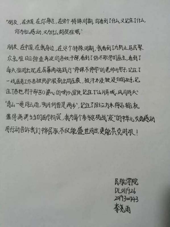 DL011926支部李尧雨:看到班级同学的手写祝福,更加让我认识到—虽然我们不能前往一线切实为需要的人服务,但并不代表我们就只能当一个旁观者,我们依然可以用自己的方式送去真挚的祝福,而这些话语也是对身边人的鼓励,激励着身边人众志成城,共克时艰!