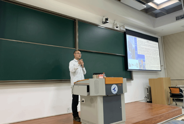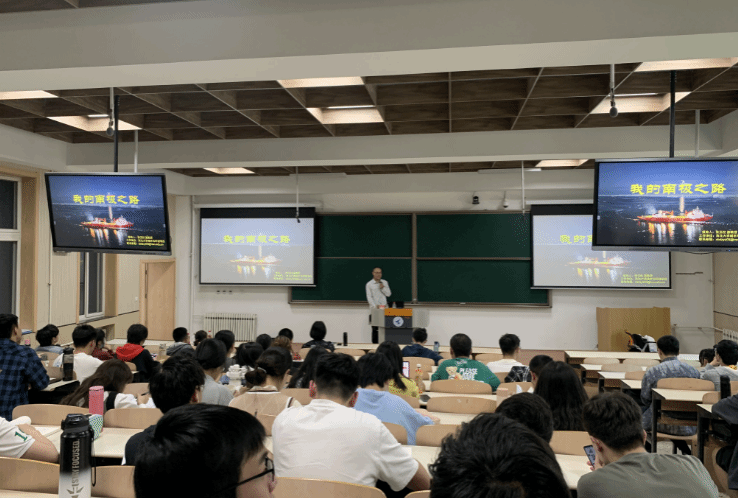 报告中,张玉柱首先以南极特殊的地理位置为切入点,向与会师生介绍了中国和其他国家在南极的科考历史和科考先驱代表,以及近期在南极地区取得的部分重大科研成果。随后,他介绍了自己如何乘坐“雪龙号”科考船穿越西风带,到达中山站、罗斯海新站,并成功开展科考工作等方面的亲身经历。此外,他还对南极科考站的构成与地理位置、“双龙探极——科考新格局”、直升机保障、船舶保障、考察队员组成、考察路线等内容进行了详细的介绍。他用大量生动的影像展示了在南极开展科考的日常生活、极地风景和动物、极昼现象等场景,让大家既身临其境领略了南极的独特魅力,又感同身受体验科考队员面临的艰苦环境。张玉柱表示,南极科考是一项综合性很强的工作,因此,需要各方面的专业人才加入进来。科考队员的选拔不仅面向环境、气候、地质等学科专业的科研人员,从事生物、通信、天文、装备,包括航空、航天、航海等领域的科研人员也都可以申请到南极开展相应的科研工作。最后,他鼓励同学们认真学好专业知识,思考本专业科学问题与南极特点的结合,并祝愿对南极充满向往的同学能够通过不懈努力早日圆梦南极。